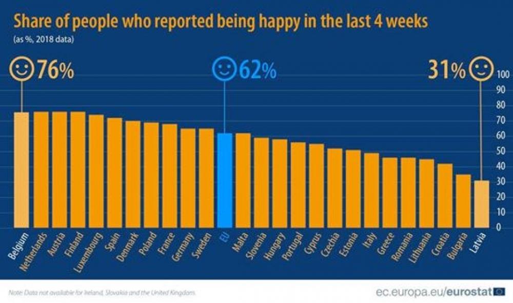 “Eurostat”ın 25 Avropa ölkəsində keçirdiyi sorğulara əsasən özünü ən az xoşbəxt hiss edənlər latviyalılardır.  Aparılan sorğularda məlum olub ki, Latviya əhalisinin yalnız 31 faizi özünü xoşbəxt hiss etdiyini bildirib. Özlərini ən xoşbəxt