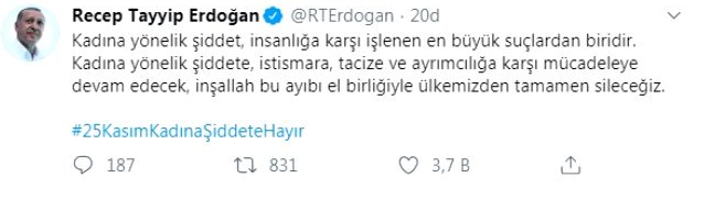 Türkiyə Prezidenti Rəcəb Tayyib Ərdoğan sosial şəbəkədə 25 noyabr- Qadın Zorakılığına qarşı Beynəlxalq Mübarizə Günü ilə bağlı paylaşım edib.