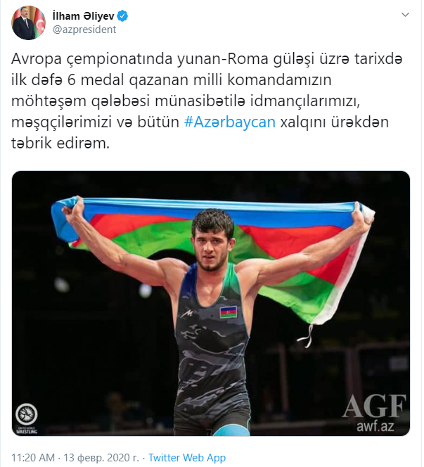 “Avropa çempionatında yunan-Roma güləşi üzrə tarixdə ilk dəfə 6 medal qazanan milli komandamızın möhtəşəm qələbəsi münasibətilə idmançılarımızı, məşqçilərimizi və bütün Azərbaycan xalqını ürəkdən təbrik edirəm”, - deyə paylaşımda qeyd olunub.